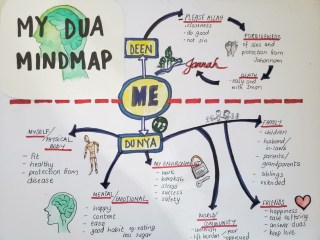 The purpose of using this tool, over simply listing is that the subheadings or branches, just provide a logical structure to ensure everything is covered. The creative process provides a lovely flow as thoughts keep popping up, and I could easily capture it under each branch. It also brought to my consciousness some things in my life that I wanted changed, yet I was not explicitly making dua for it! So I could now add it my comprehensive dua list.