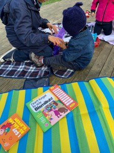 Activity : Puppet Show – I did a small puppet show about a giraffe and a penguin (the hand puppets I had at home!) where the Penguin wants to play but the Giraffe says he needs to tidy up first. So the penguin helps him to tidy up (kindness) so they can play together.